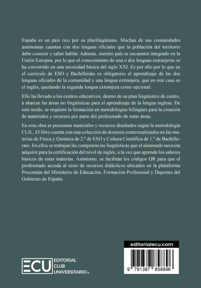 En esta obra se presentan materiales y recursos diseñados según la metodología CLIL. El libro cuenta con una colección de dosieres contextualizados en las materias de Física y Química de 2.º de ESO y Cultura Científica de 1.º de Bachillerato. En ellos se trabajan las competencias lingüísticas que el alumnado necesita adquirir para la certificación del nivel de inglés, a la vez que aprende los saberes básicos de estas materias. Asimismo, se facilitan los códigos QR para que el profesorado acceda al resto de recursos didácticos ubicados en la plataforma Procomún del Ministerio de Educación, Formación Profesional y Deportes del Gobierno de España.