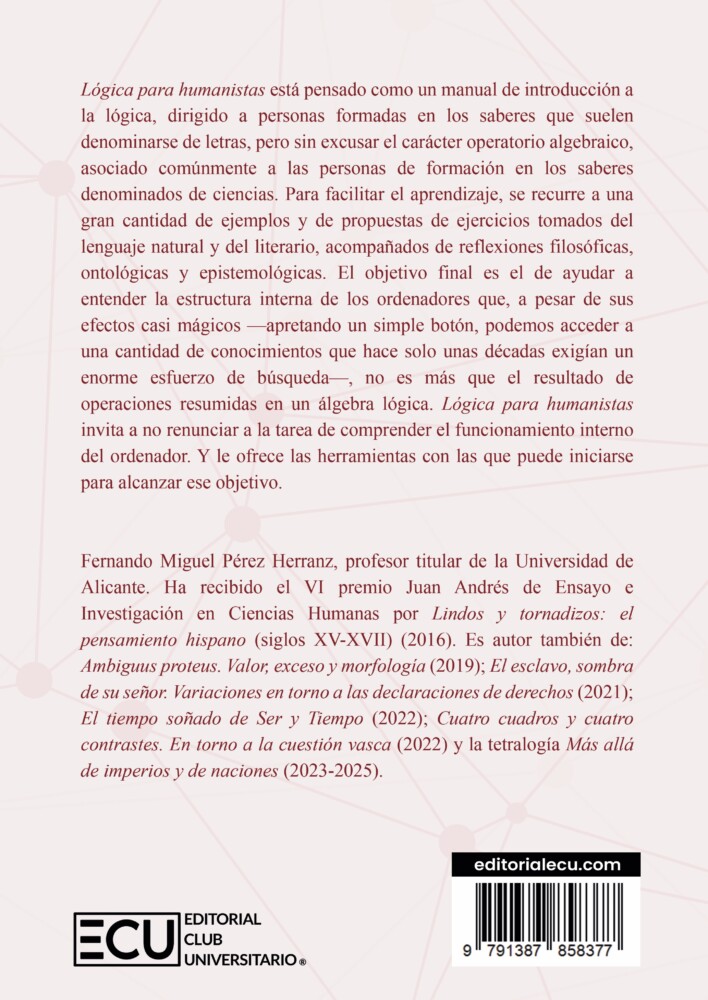 Lógica para humanistas está pensado como un manual de introducción a la lógica, dirigido a personas formadas en los saberes que suelen denominarse de letras, pero sin excusar el carácter operatorio algebraico, asociado comúnmente a las personas de formación en los saberes denominados de ciencias. Para facilitar el aprendizaje, se recurre a una gran cantidad de ejemplos y de propuestas de ejercicios tomados del lenguaje natural y del literario, acompañados de reflexiones filosóficas, ontológicas y epistemológicas. El objetivo final es el de ayudar a entender la estructura interna de los ordenadores que, a pesar de sus efectos casi mágicos apretando un simple botón, podemos acceder a una cantidad de conocimientos que hace solo unas décadas exigían un enorme esfuerzo de búsqueda , no es más que el resultado de operaciones resumidas en un álgebra lógica. Lógica para humanistas invita a no renunciar a la tarea de comprender el funcionamiento interno del ordenador. Y le ofrece las herramientas con las que puede iniciarse para alcanzar ese objetivo.