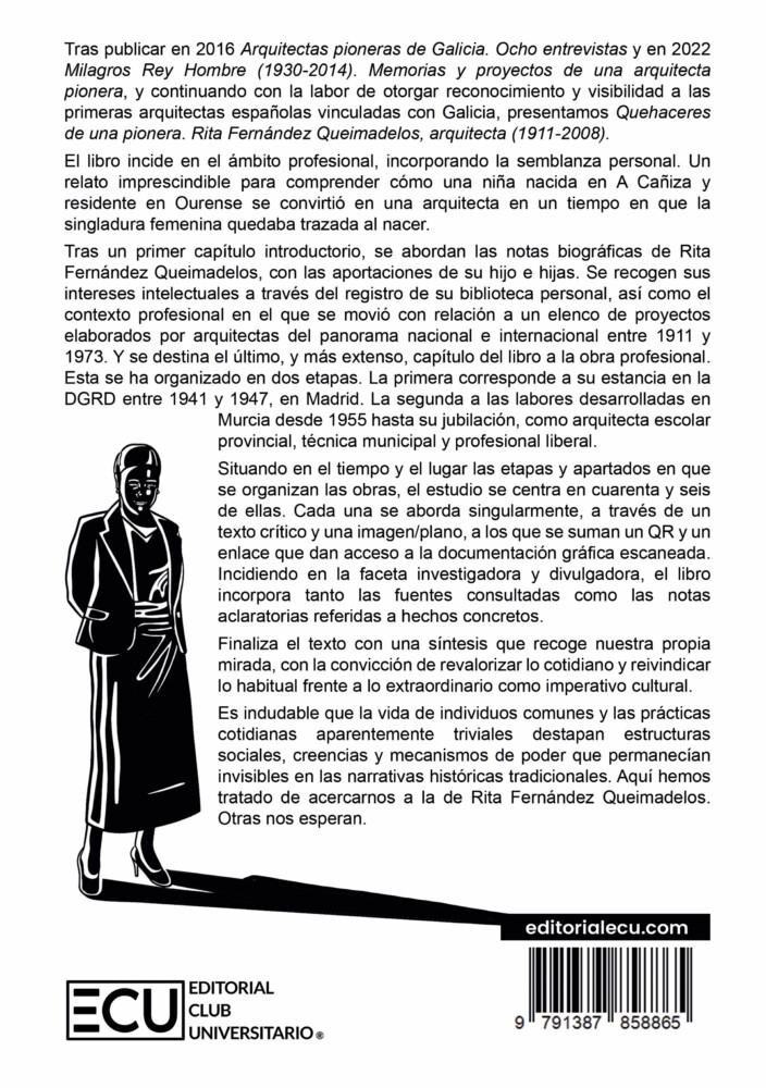 Tras publicar en 2016 Arquitectas pioneras de Galicia. Ocho entrevistas y en 2022 Milagros Rey Hombre (1930-2014). Memorias y proyectos de una arquitecta pionera, y continuando con la labor de otorgar reconocimiento y visibilidad a las primeras arquitectas españolas vinculadas con Galicia, presentamos Quehaceres de una pionera. Rita Fernández Queimadelos, arquitecta (1911-2008).