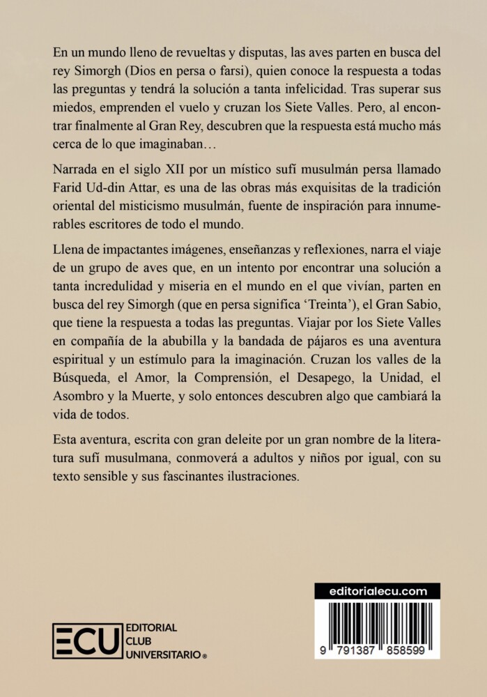 Narrada en el siglo XII por un místico sufi musulmán persa llamado Farid Ud-din Attar, es una de las obras más exquisitas de la tradición oriental del misticismo musulmán, fuente de inspiración para innumerables escritores de todo el mundo